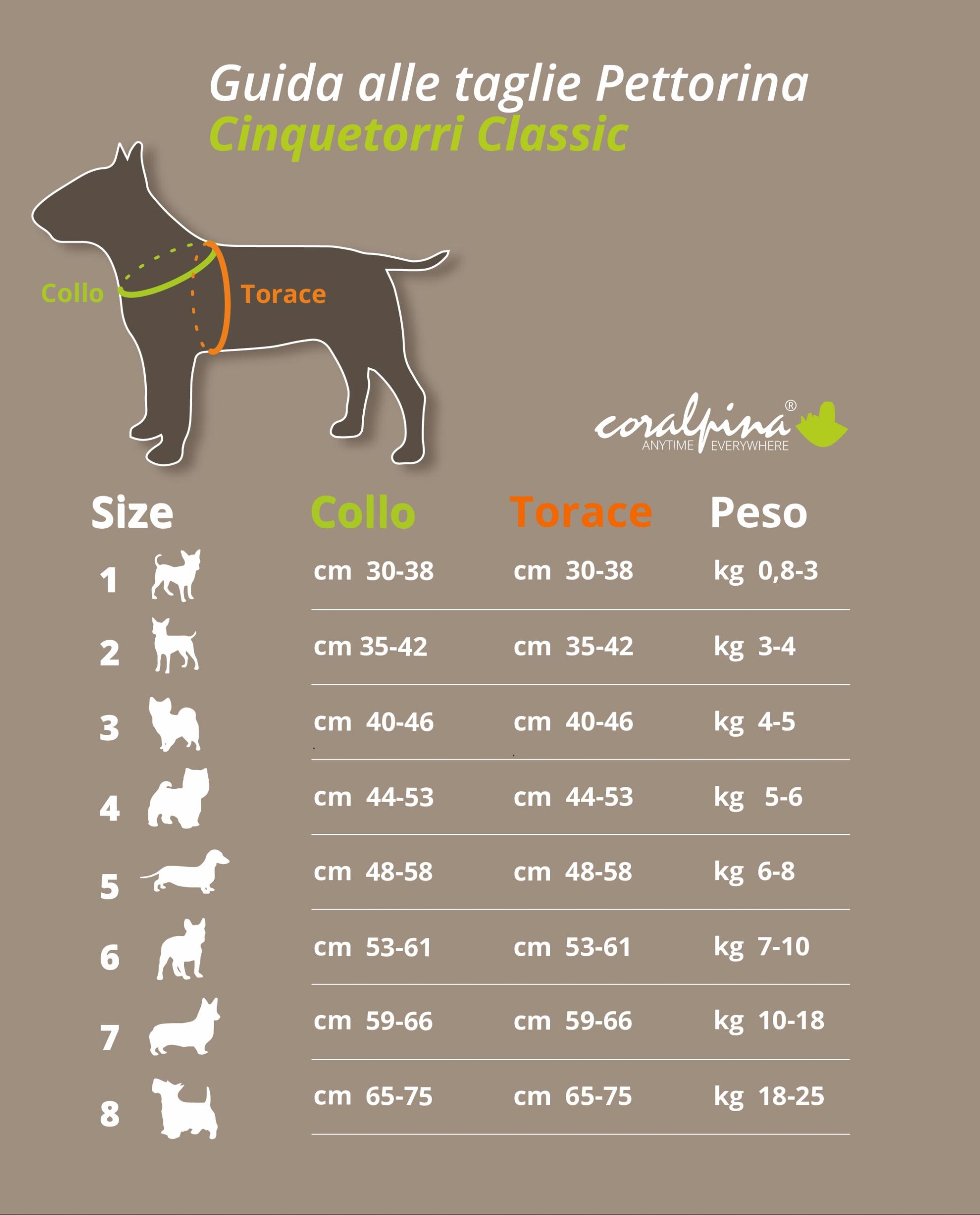 • Veste ogni taglia: Disponibile in 8 misure differenti, adatte a cani da 0,8 kg fino a 25 kg. È la pettorina perfetta per soggetti con un rapporto collo/torace equilibrato.