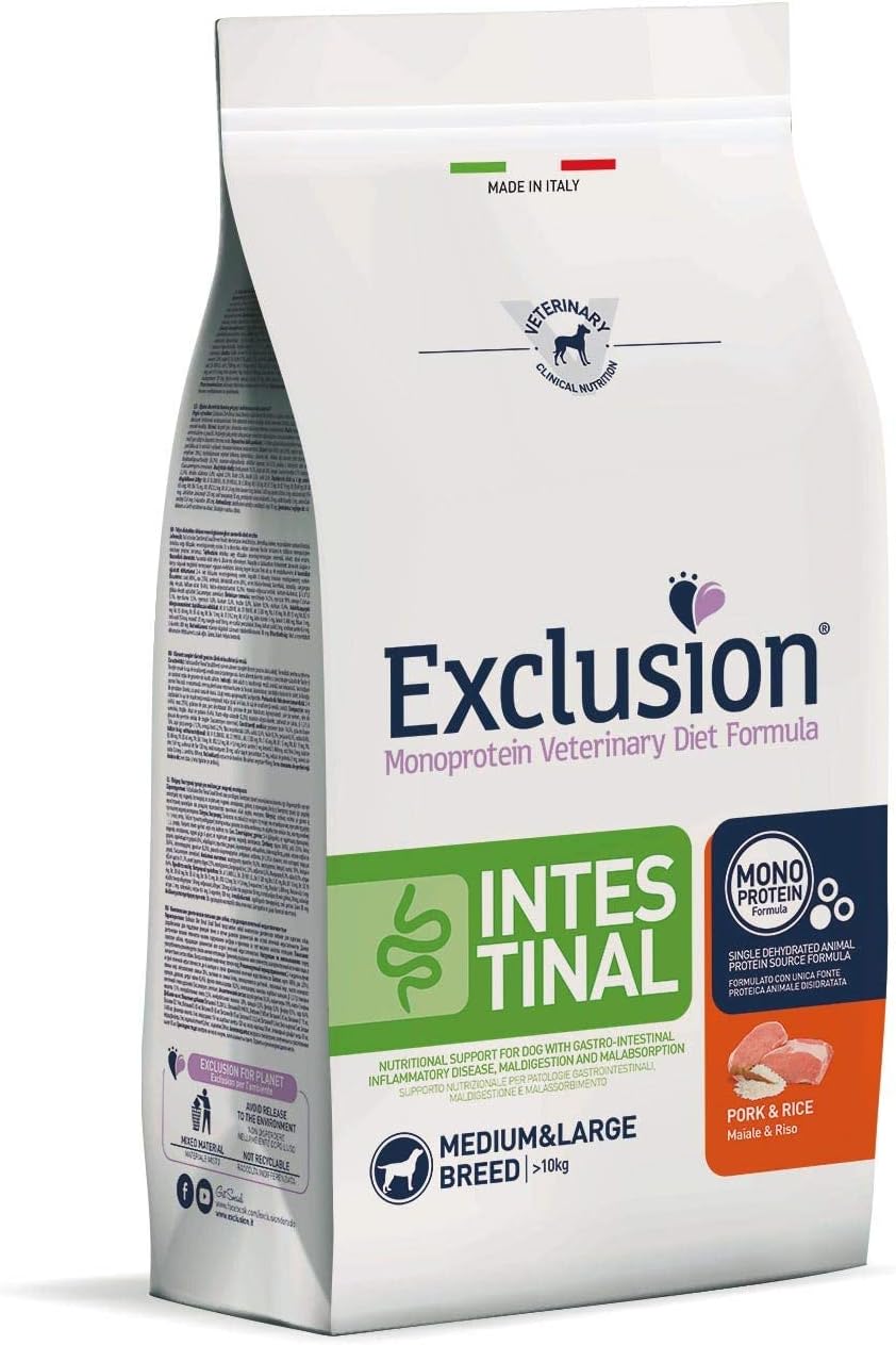 • Le crocchette Exclusion monoprotein Vet Diet Intestinal medium e large breed sono un alimento completo dietetico per cani adulti formulato per la riduzione dei disturbi acuti dell’assorbimento intestinale e compensazione della cattiva digestione